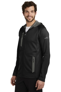 This athletic inspired, mid weight jacket pairs smooth faced fleece with stretch side panels for comfort during active adventures. Has reverse coil zippers, a welded zippered chest pocket and welded front zippered pockets. Has a contrast Eddie Bauer logo heat transfer on left sleeve.